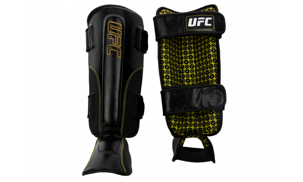 Защита голени на липучках UFC изготовлена из натуральной воловьей кожи класса А. Модель имеет слой контурированной эргономичной пены Eva толщиной более 3,75 см. Особенностями изделия является система застежки из твердой кожи и нескользящая при намокании подкладка.